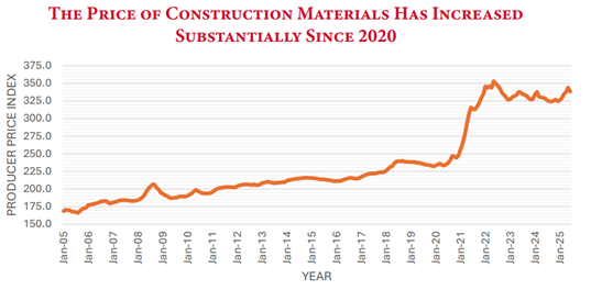 Research shows that the hike in national prices of construction materials is a result of inflation, uncertainty in trade agreements, and supply chain disruptions.