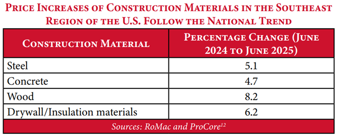 The next Table shows the percentage change in material prices for the southeast region of the U.S.